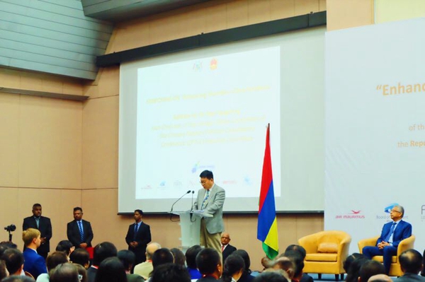 韩方明主席首先在致辞中回顾了中非关系以及中毛关系的历史和现状,并表示,希望以下月将在北京召开的“一带一路”国际合作高峰论坛为契机,加强中毛之间的合作,发挥毛里求斯作为连接中国和非洲的“枢纽”作用。