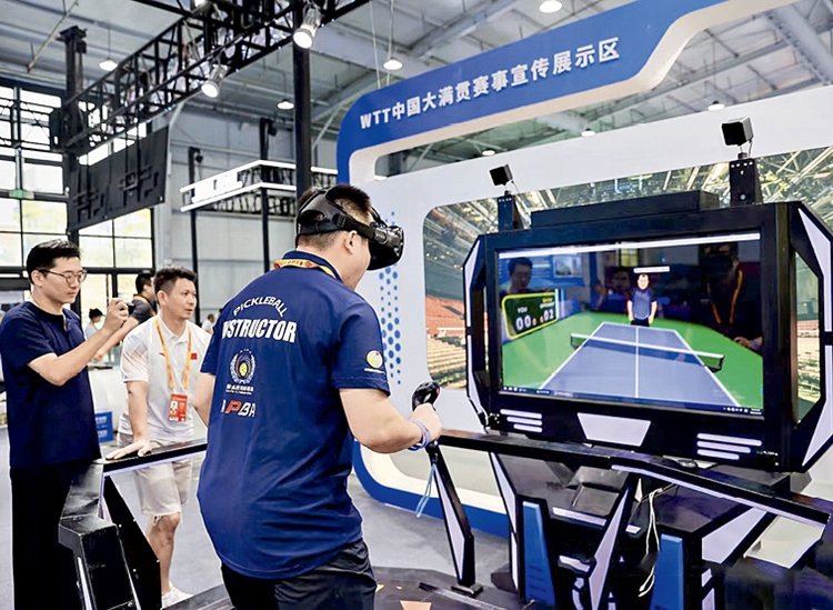在国家体育消费和赛事经济试点展区,虚拟乒乓球运动正吸引着观众上前尝试