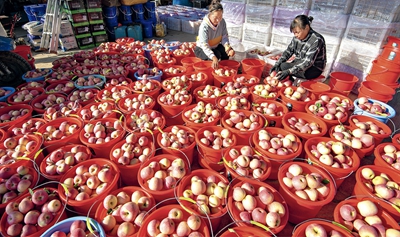 2025年9月,村民们在山西省晋中市左权县桐峪镇农产品交易市场内分拣苹果 图/张文军