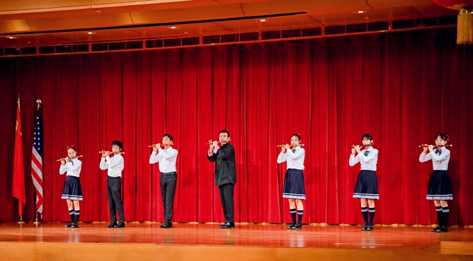 2024年,刘笑然(中)带领受邀访美的北京市中小学生代表一起在中国驻华盛顿总领馆演出
