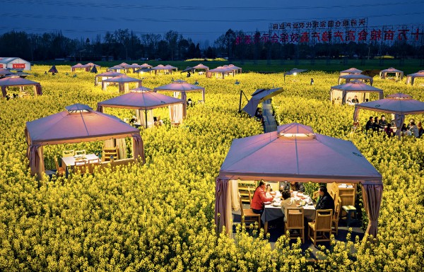 2026年3月5日,四川省成都市崇州隆兴镇黎坝村,游客在油菜花田里品尝火锅