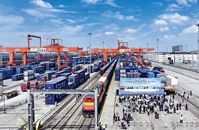 2025年5月28日,首趟满载电子配件、电视机配件等货物的“蓉深港图定班列”从位于成都市青白江区的成都国际铁路港中铁联集成都中心站鸣笛启程