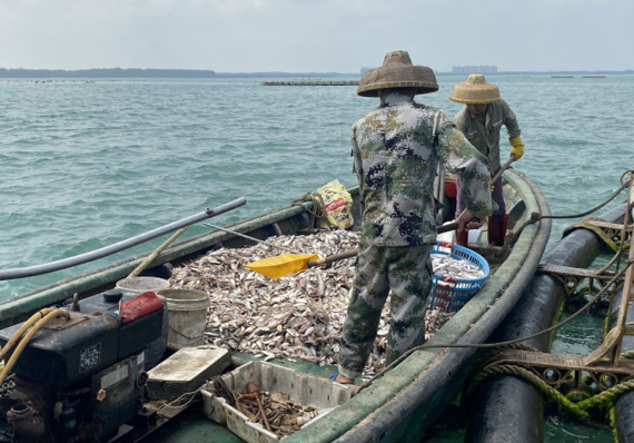 2022年3月21日,海南省澄迈县桥头镇玉包村,深水网箱养殖项目的养殖员正在翻搅饲料