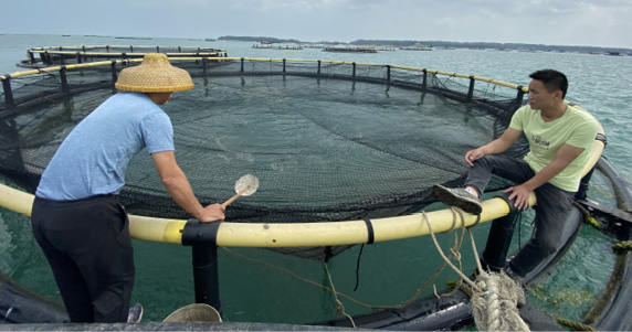 “开饭啦,开饭啦,多吃点,长得胖胖哦。”在海南省澄迈县桥头镇玉包村,深水网箱养殖项目的养殖员兼技术员黄忠岸正忙着给网箱中的军曹鱼投放饲料,还不时抖动渔网,驱赶飞鸟。