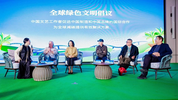 2025年涠洲岛绿地毯影视周论坛现场,众嘉宾畅谈文艺界绿色发展。从左至右:傅缤卉、费利普·弥勒、宁宁、卢奇、高群书、束焕