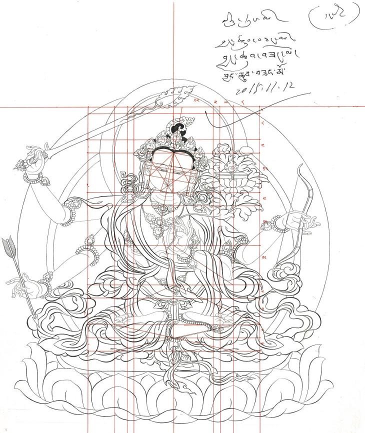 提到唐卡绘画,就绕不开“造像量度”。唐卡艺术中的“造像量度”承载着多重文化功能,既是宗教规范的守护者,又是艺术传承的基石。作为宗教绘画的核心规范,“造像量度”严格规定了佛像的比例、姿态和服饰等细节,确保其符合佛教教义。刘冬梅指出:“造像量度不仅是技艺的传承,更是宗教精神的体现。”即便在现代创新中,年轻画师仍需恪守传统度量,以维护作品的神圣性。这种规范不仅体现在佛像的身体比例、手印和法器上,更成为宗教信仰的物质载体。