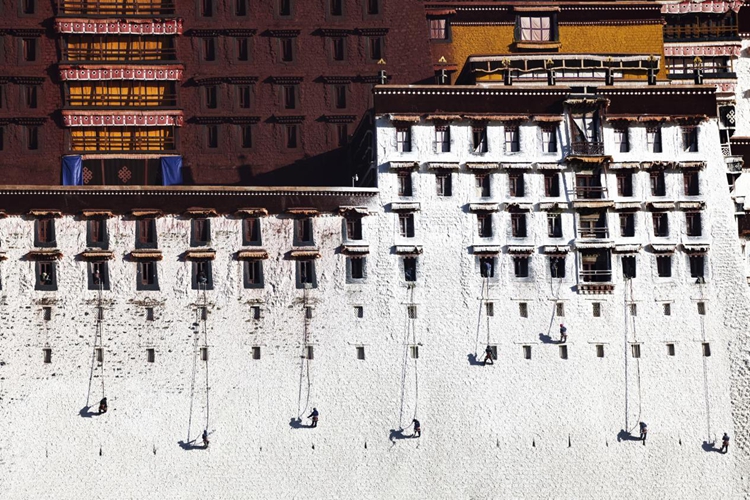 专业工作人员化身“蜘蛛人”粉刷布达拉宫