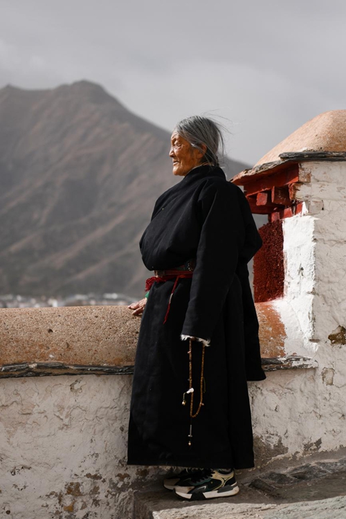藏族老妈妈站在布达拉宫的宫墙上感受岁月的变迁