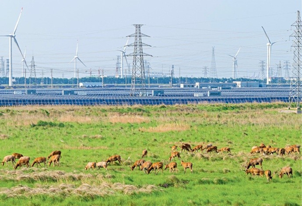2025年5月28日,江苏省盐城市大丰区滩涂“风补渔”产业示范基地,风力发电机与光伏板协同运转,源源不断输送绿色能源