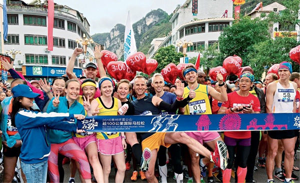 龙迪(一排中间)与外国选手一起庆祝完成贵州雷公山超100公里国际马拉松赛