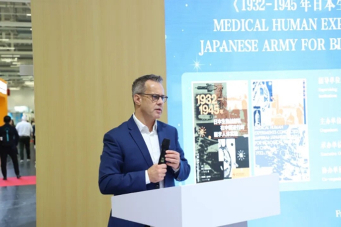 黄昳扬在致辞中指出,《1932—1945年日本生物战部队在中国进行的医学人体实验》是我驻法兰克福总领馆发掘的图书。在作品中,著名医学家、德国海德堡大学医学院全球卫生研究院院长蒂尔·巴尼格豪森教授以中立、客观的视角审视剖析了日本、美国、德国和中国等地保存或出版的重要历史文献,客观记录了抗日战争和二战期间日本生物战部队进行人体实验的历史,非常明确、肯定地提出了多个关键结论和批判性评价,表达出对人类良知、公平正义、世界和平的守护与呼唤,让全球读者清楚地认识到,日本侵华战争史实真相不可篡改,对于敦促有关国家正确认识和对待历史、反省罪责、同军国主义彻底划清界限具有特殊价值。