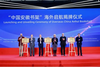 为更好对外展示中国安徽文化,活动期间,国图集团发挥海外渠道优势,与安徽新华发行集团共同举办了“中国安徽书架”海外启航揭牌仪式。艾立民、方晓利、金涛,以及尼泊尔当代出版公司总裁凯兰·高塔姆(Kiran Gautam),南非Loot公司图书商业部总监马丁·贝克尔(Martin Bekker),大洋洲作家与出版商协会名誉主席露易丝·拉塞尔(Louise Russell共同为首批落地海外的中国安徽书架揭牌。“中国安徽书架”走向海外,旨在展示安徽文化底蕴与出版成果,搭建与“一带一路”共建国家文化交流的桥梁,将为国际读者打开又一扇了解中国、认识安徽的窗口。