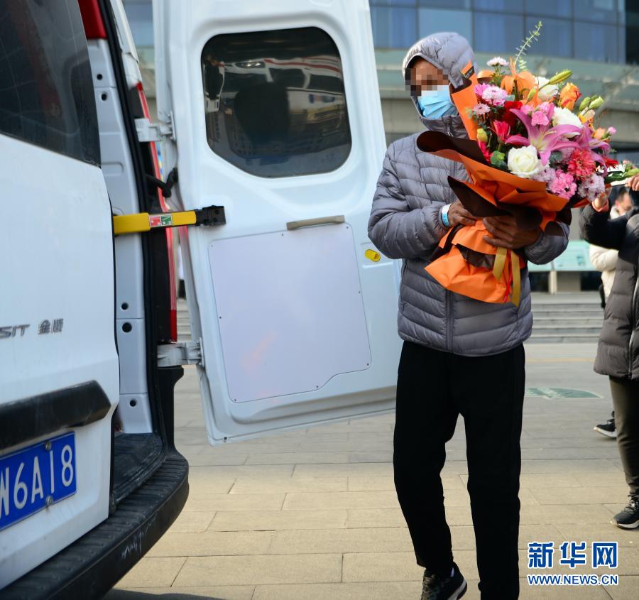 1月14日,在河北省胸科医院,医生为治愈出院的新冠肺炎患者献上花束。新华社记者 金皓原 摄