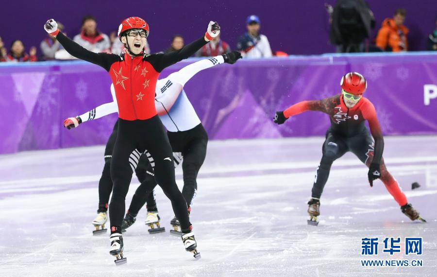 这是2018年2月22日,在平昌冬奥会短道速滑男子500米决赛中,中国选手武大靖夺冠后庆祝。新华社记者 韩岩 摄